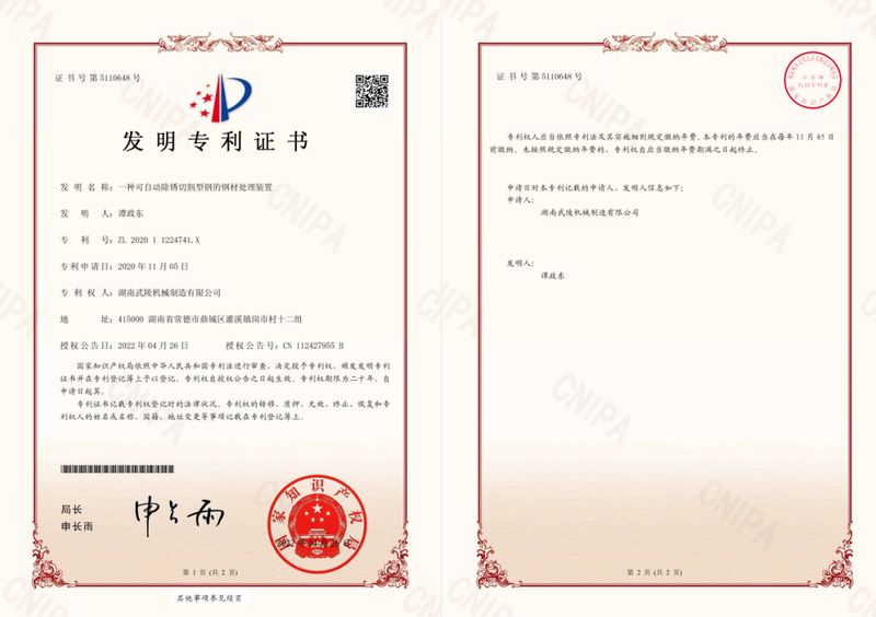 【概要描述】近日,湖南武陵机械制造有限公司研发并申报的《一种可自动除锈切割型钢的钢材处理装置》(专利号ZL202011224741.X)、《吊车车架固定支腿焊接回缩工艺》(专利号ZL202011240704.8)两项于2022年4月26日同时获得国家知识产权局颁发的发明专利证书!